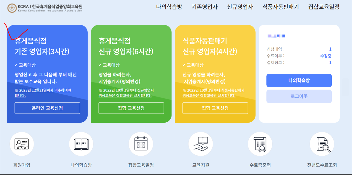회원가입을 하고 메인화면에서 휴게음식점 기존 영업자(3시간) 온라인 교육을 신청하고 결제해 주세요.