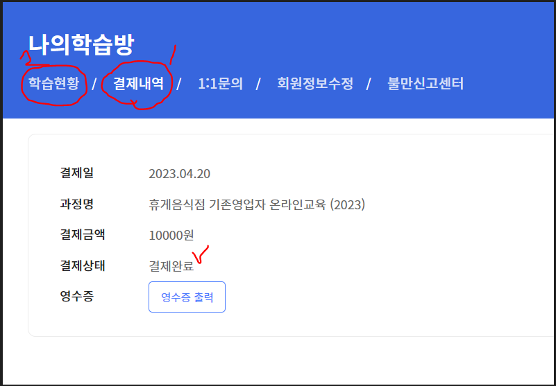 결제를 하고 몇 분 후 나의 학습방-결제내역에 결제완료 상태로 변경되면