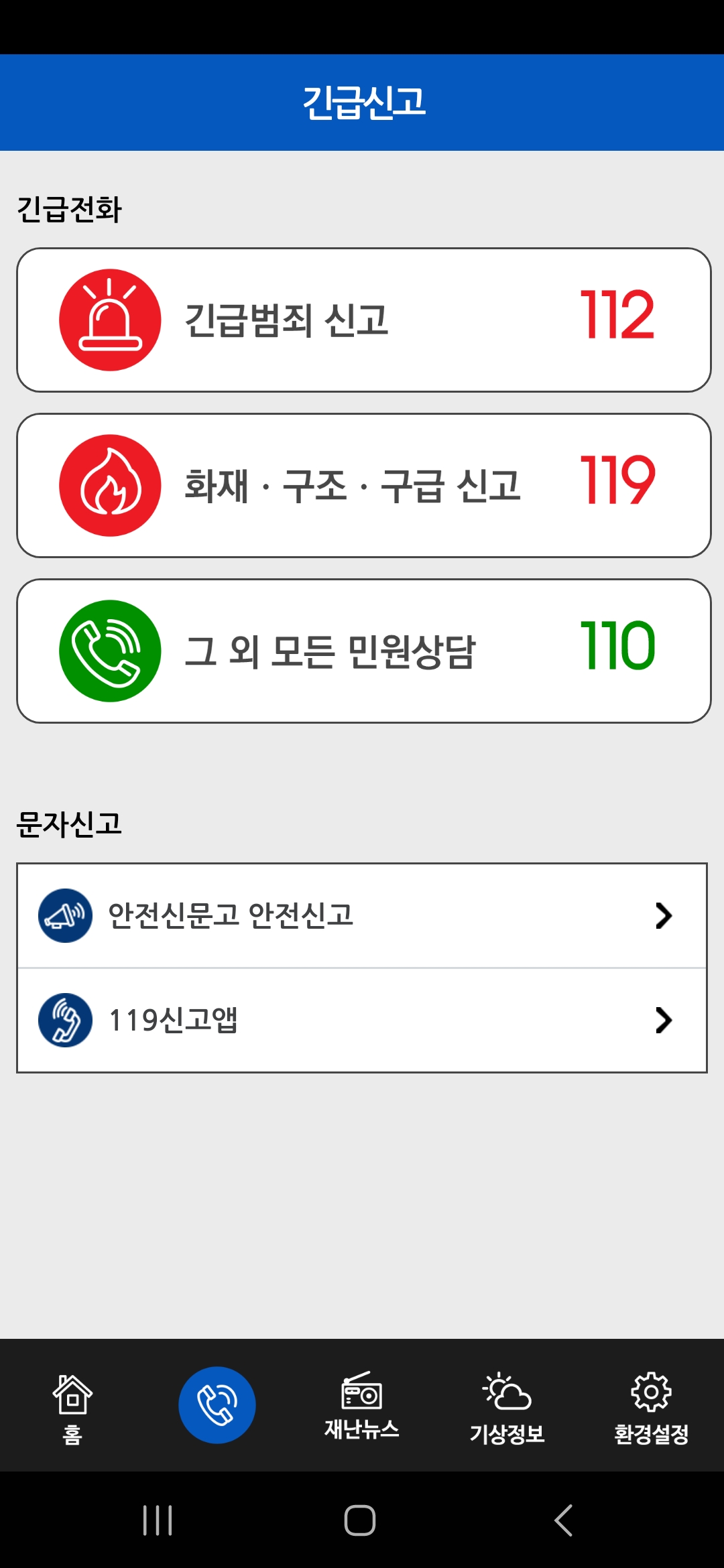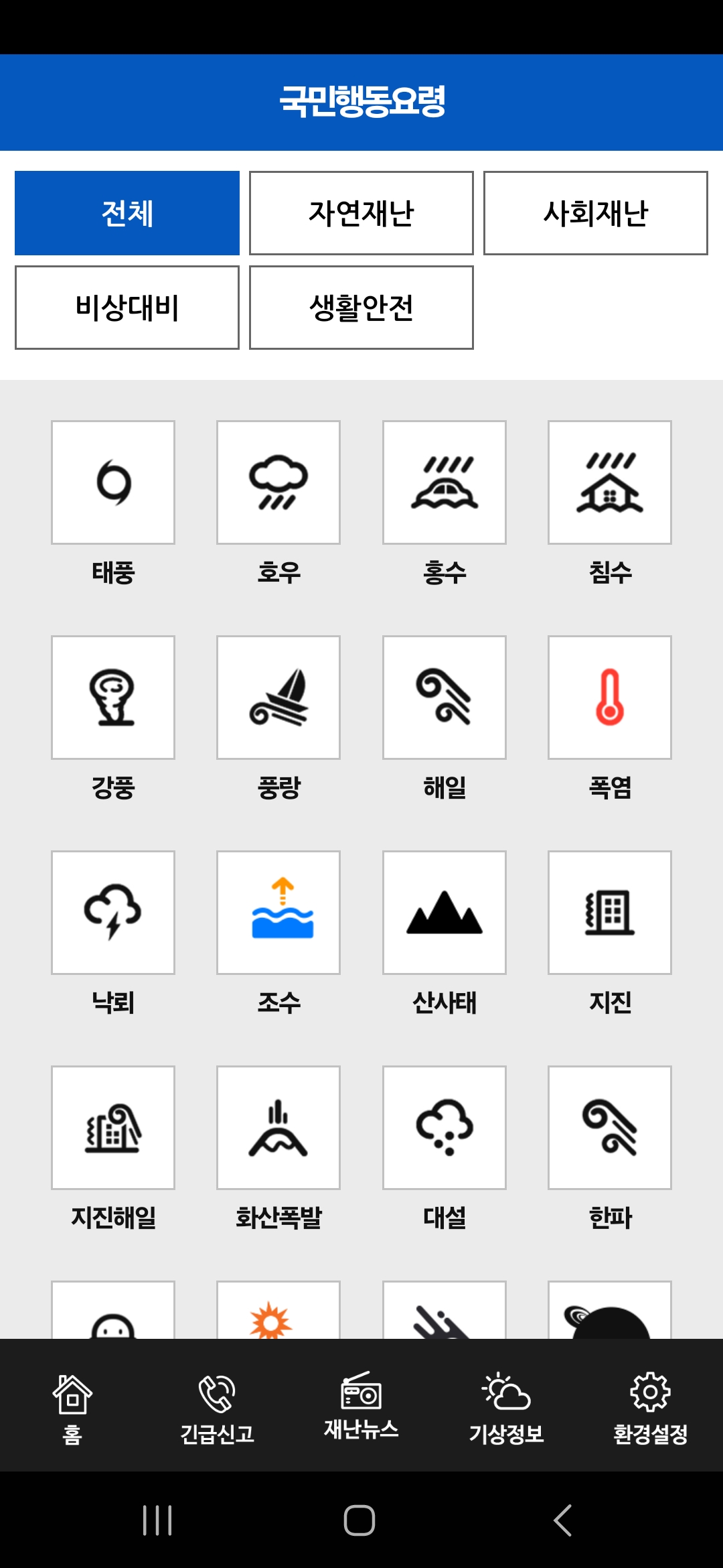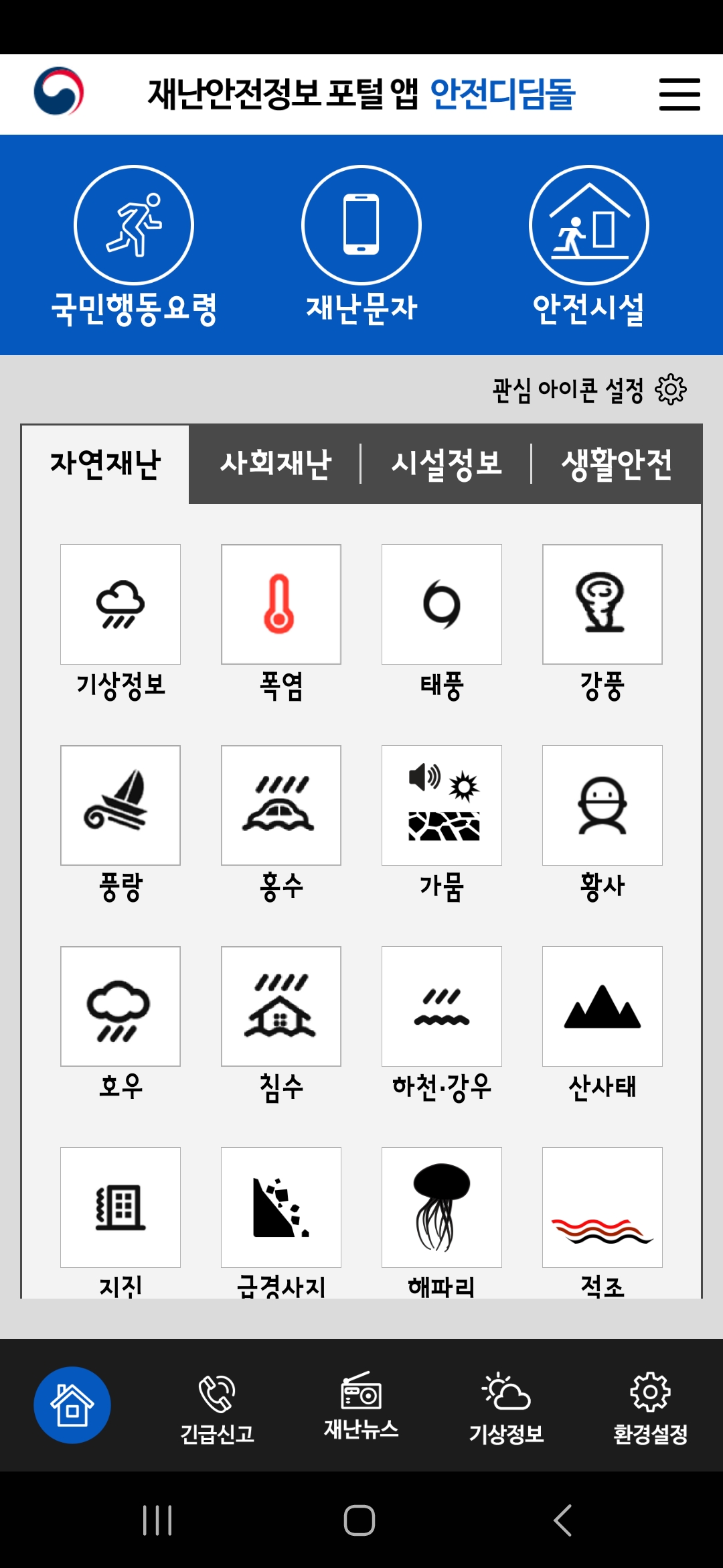 기상특보, 지진, 태풍 등 각종 재난에 대한 실시간 정보를 제공하고