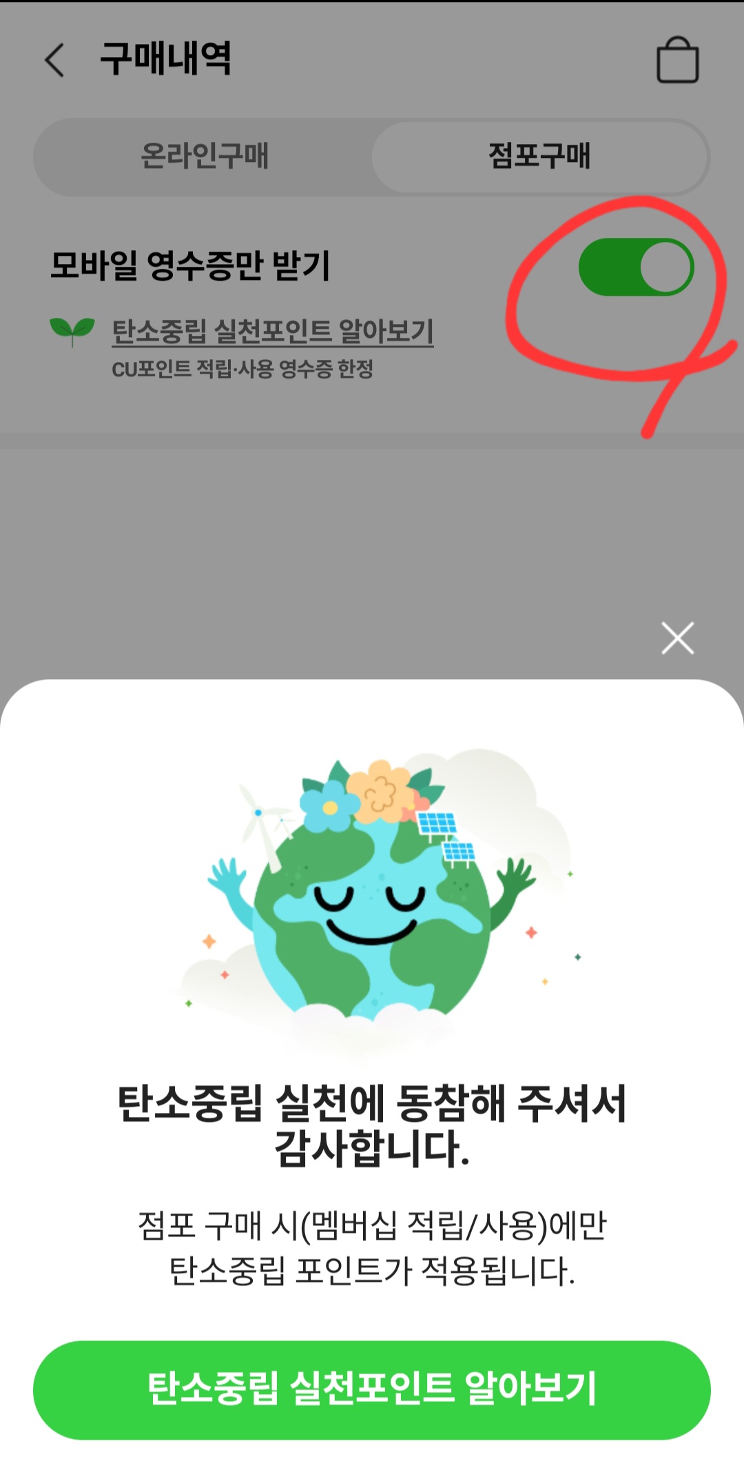 ->구매내역 터치-> 점포구매 터치 후 "모바일 영수증만 받기"를 눌러 활성화해 줍니다.