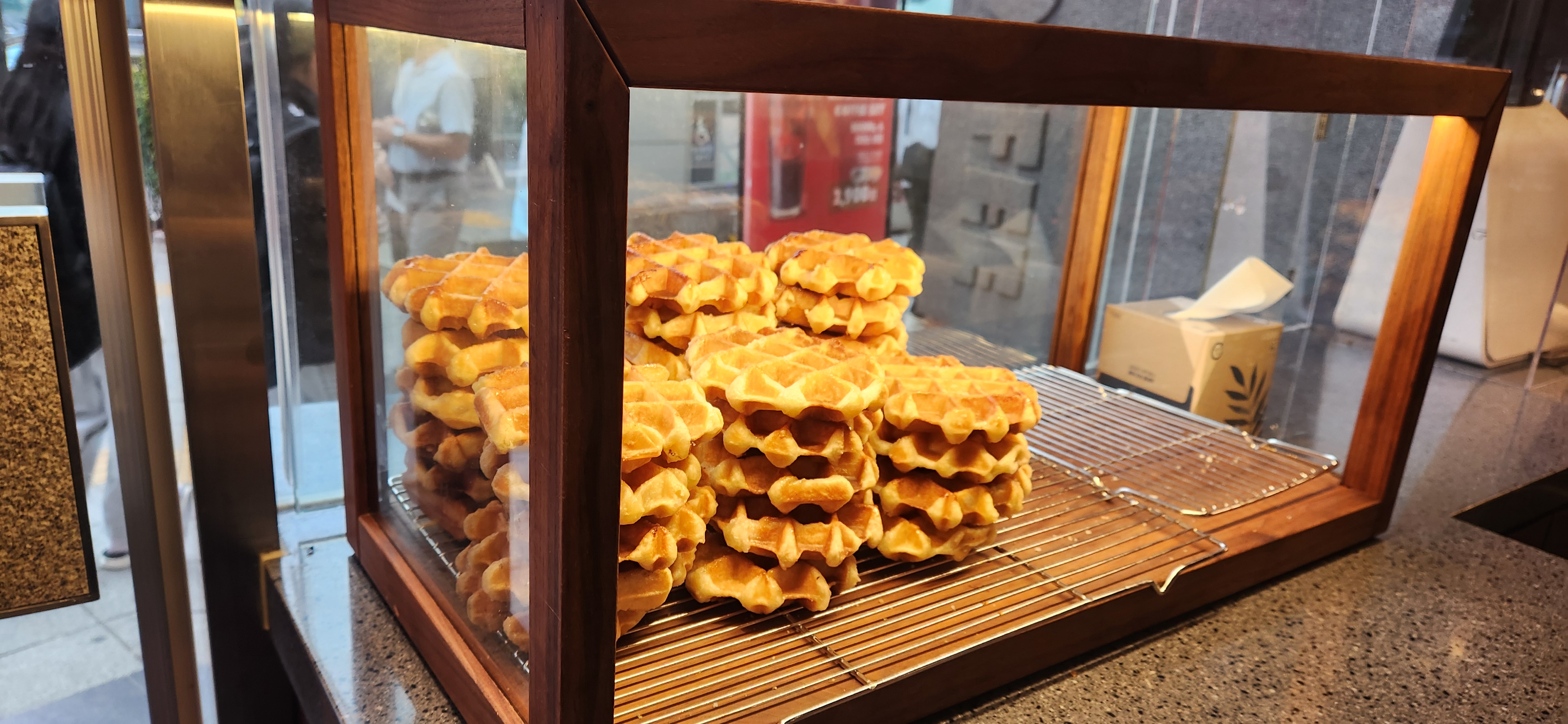 이렇게 한쪽에 막 구운듯한 와플이 쌓여있었습니다.