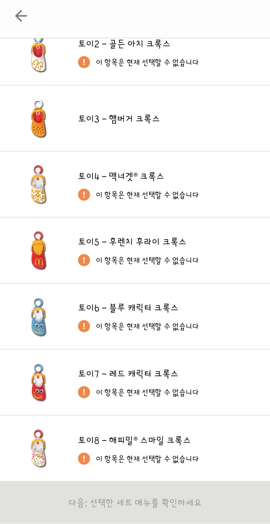 원하는 해피밀 메뉴와 옵션까지 고르고 나면 마지막에 장난감을 선택할 수 있는 창이 뜹니다.
