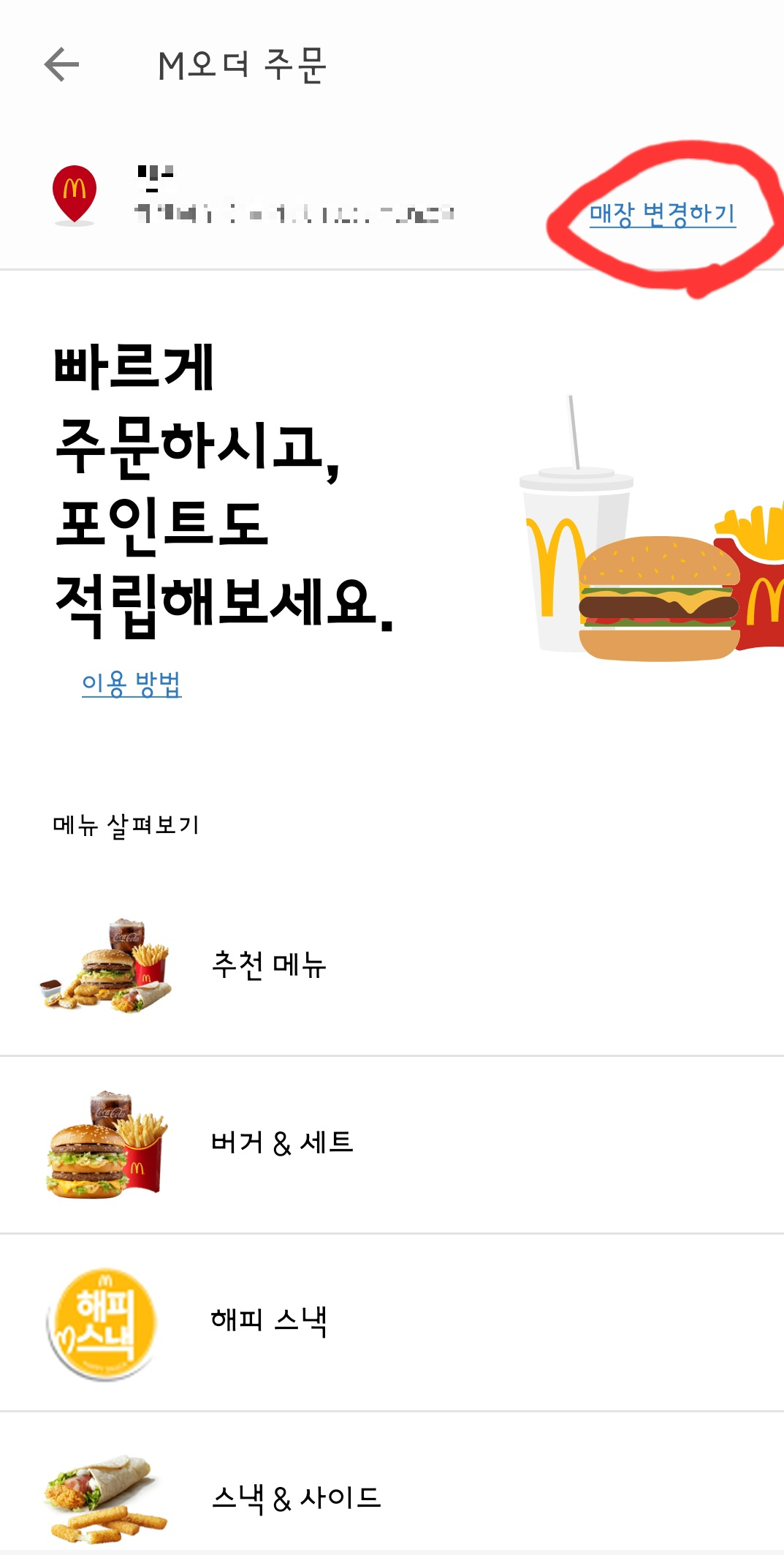 매장 선택이 완료 됐다면 아래에 해피밀을 눌러주세요.
