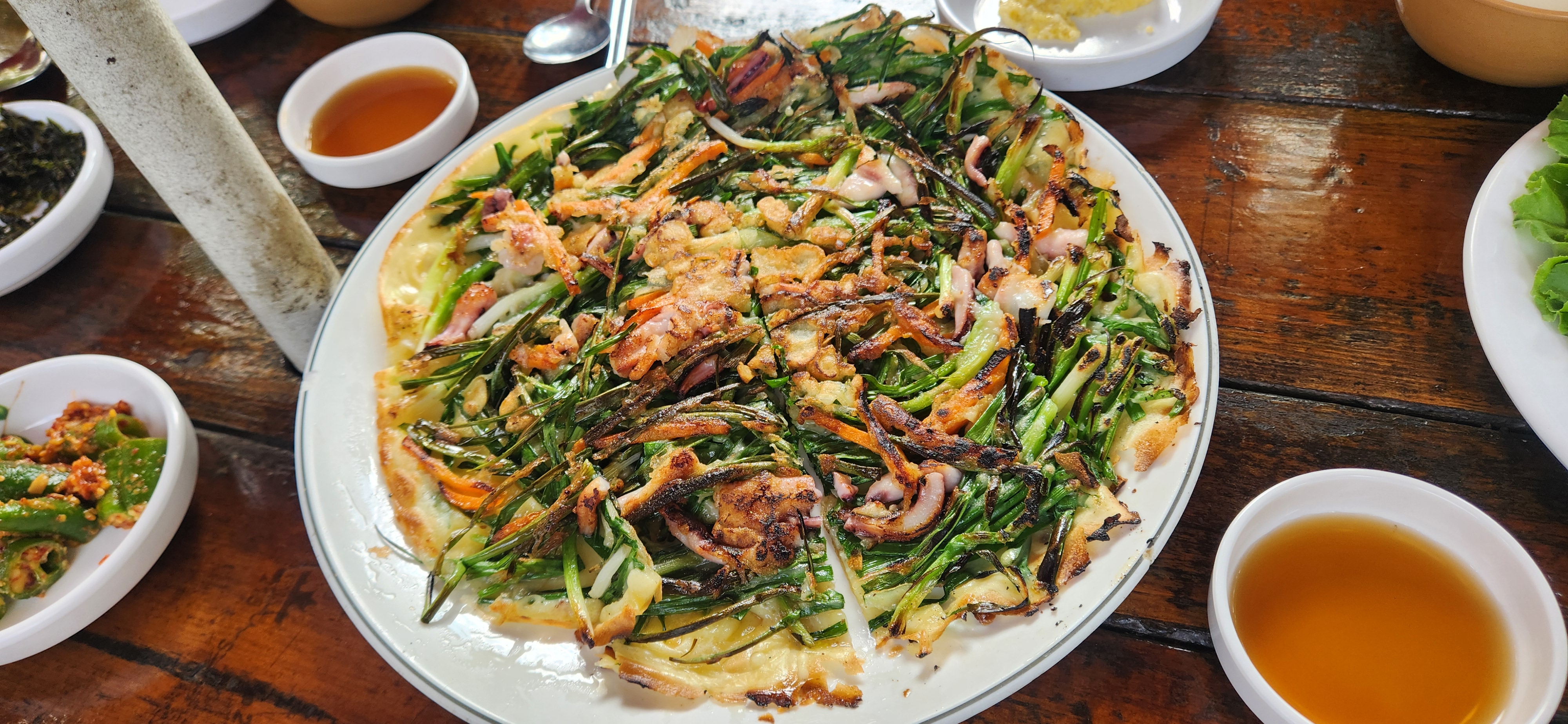 밀가루가 보이지 않을 정도로 파와 오징어가 듬뿍 올라간 해물파전 역시 바삭바삭하고 맛있었고