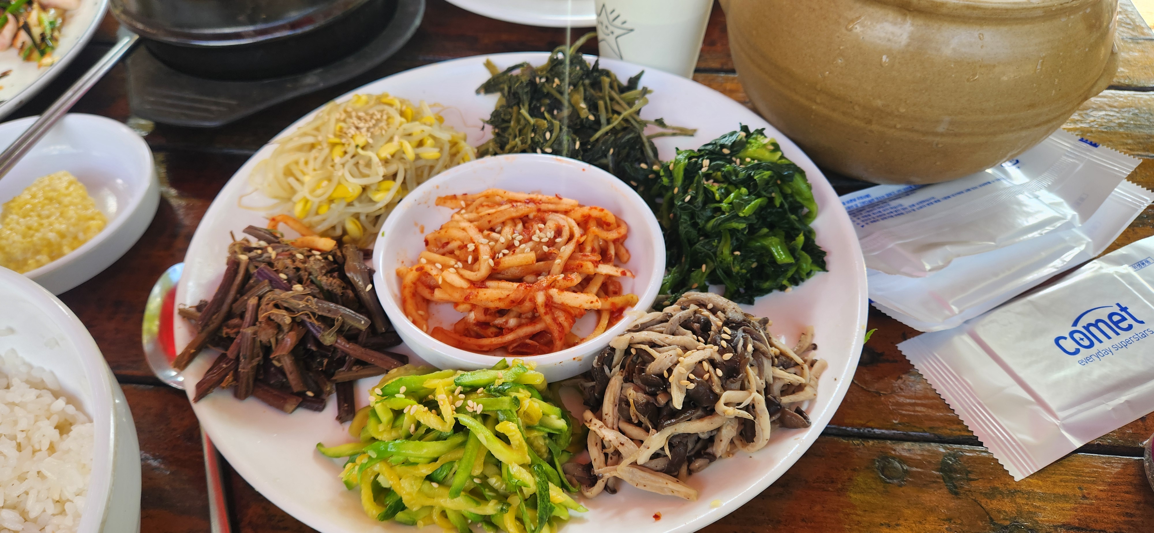 보리밥은 7가지 나물, 된장찌개와 함께 나왔는데 나물의 종류나 가짓수는 그때그때 조금씩 다른 것 같더라고요.
