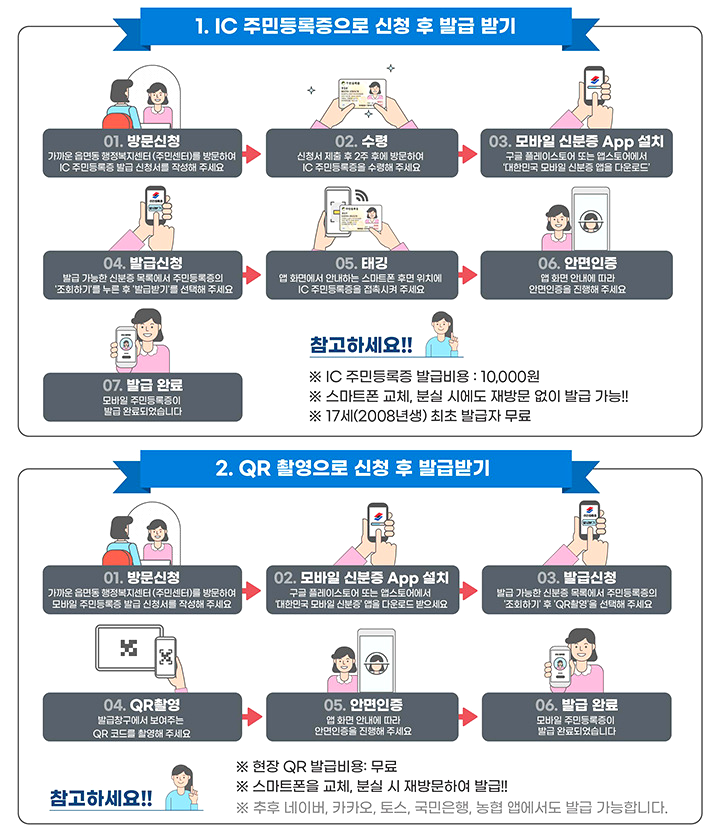 모바일 주민등록증 발급 방식에는 IC 주민등록증을 이용하는 방식이 있고, IC 주민등록증 없이 스마트폰으로 QR코드를 촬영해 발급받는 방식이 있습니다.