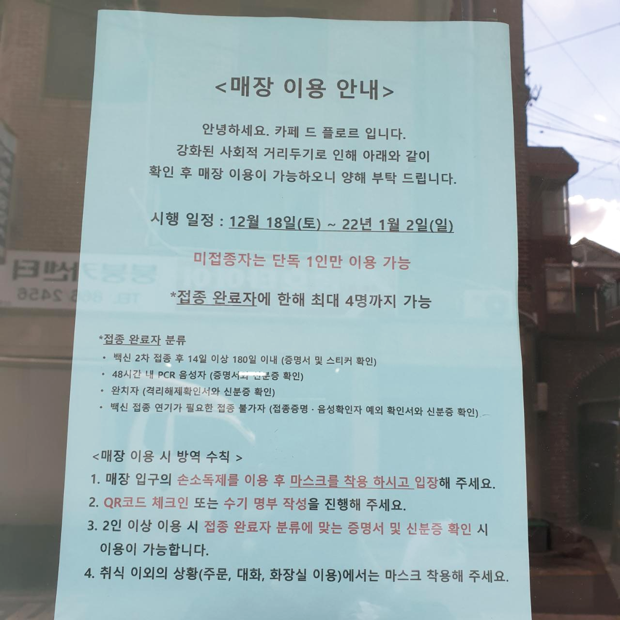 입구에 사회적 거리두기로 인한 매장 이용 안내문이 붙어있어요.