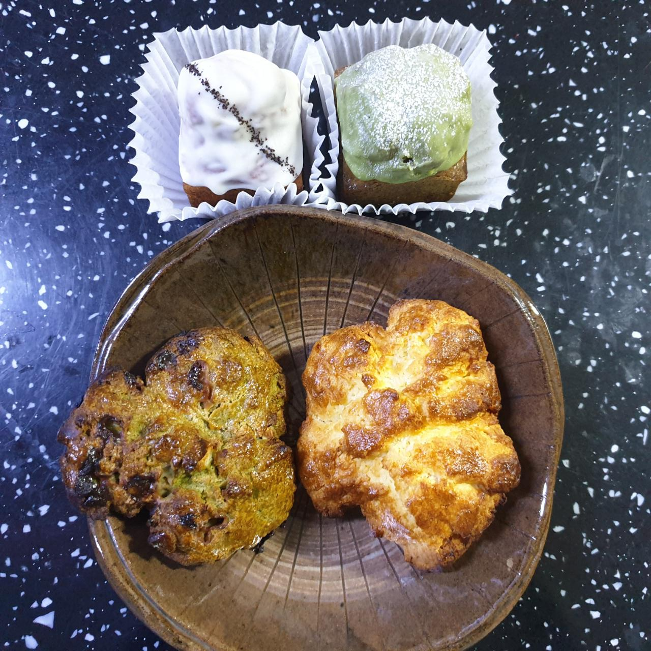 플레인 스콘 한 개와 말차&화이트 초코 스콘 한 개를 고르고