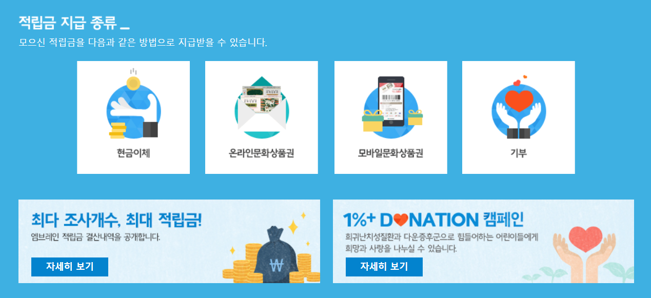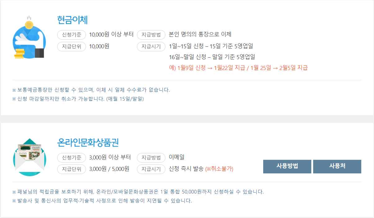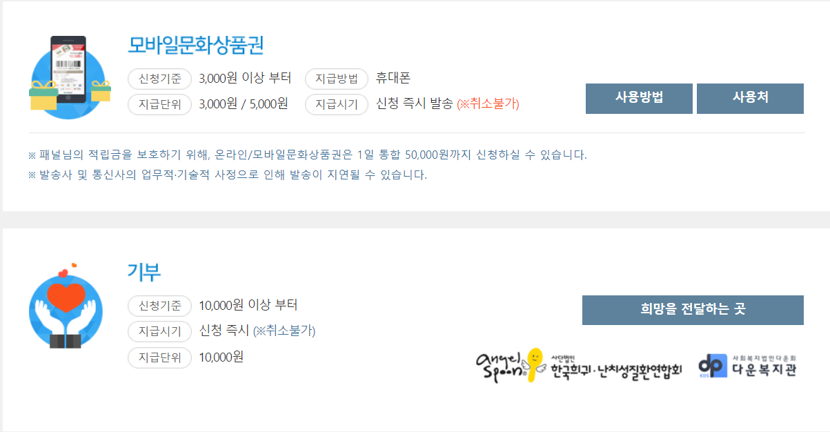 열심히 모은 적립금은 현금 이체, 온라인 문화상품권, 모바일 문화상품권, 기부