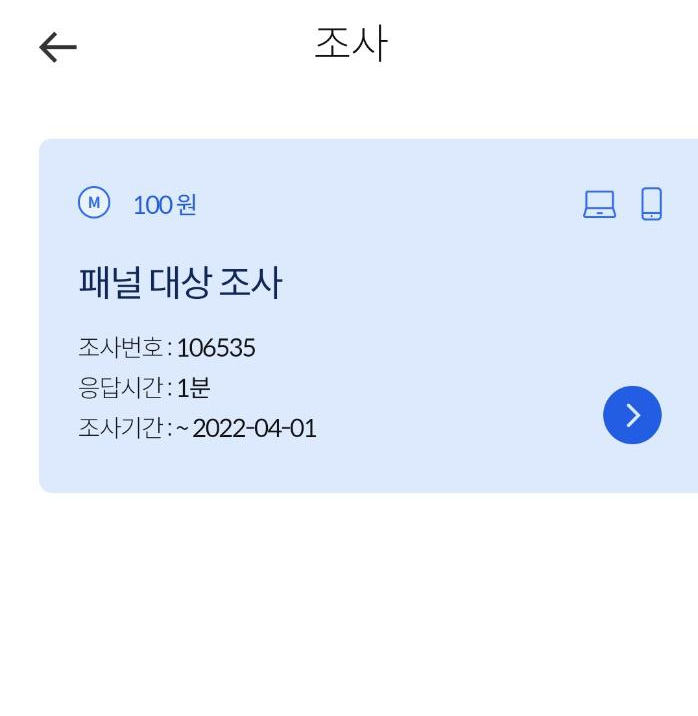 패널파워 앱을 실행시키면 메인화면에서 참여 가능한 조사를 확인할 수 있습니다.