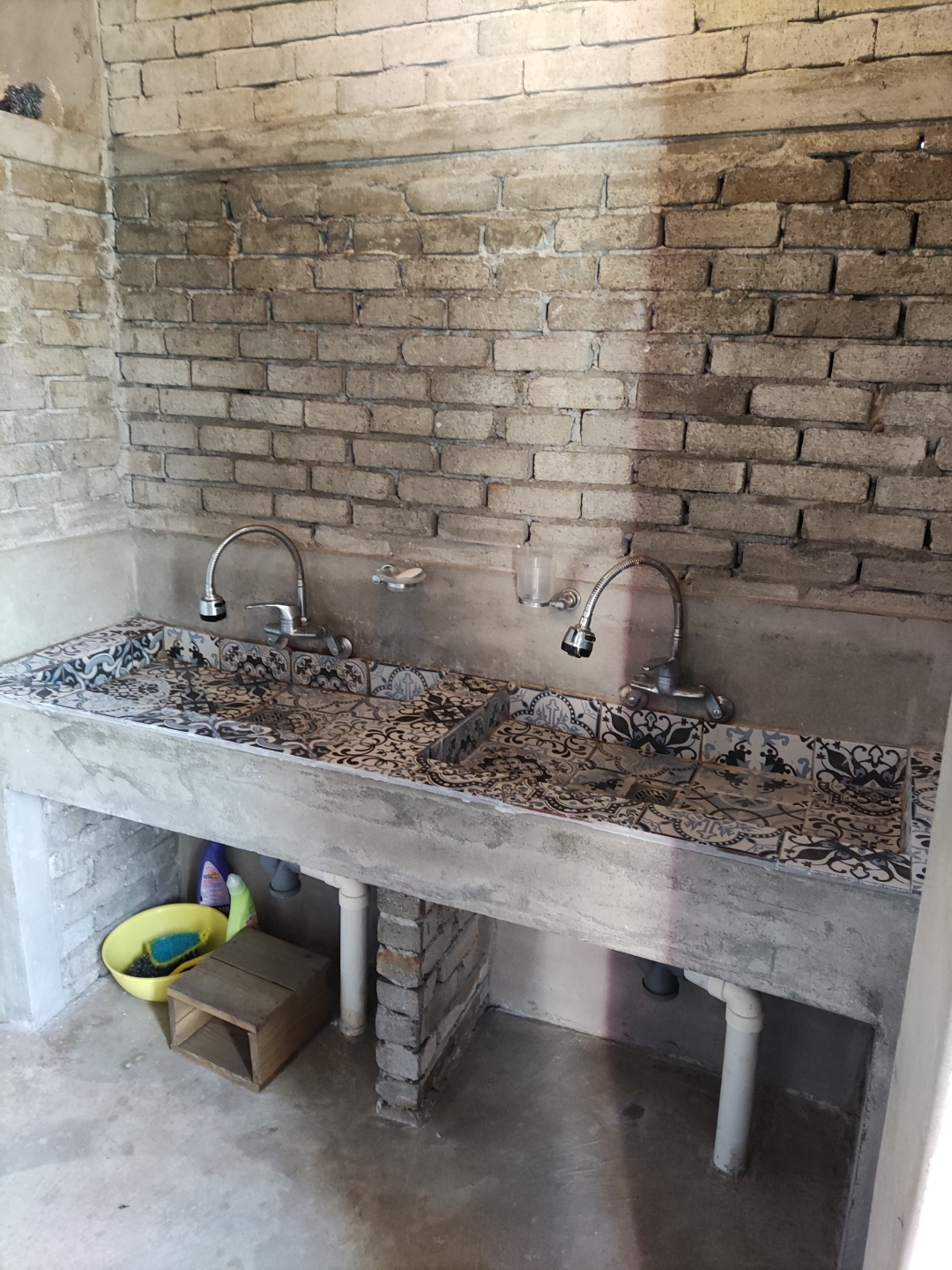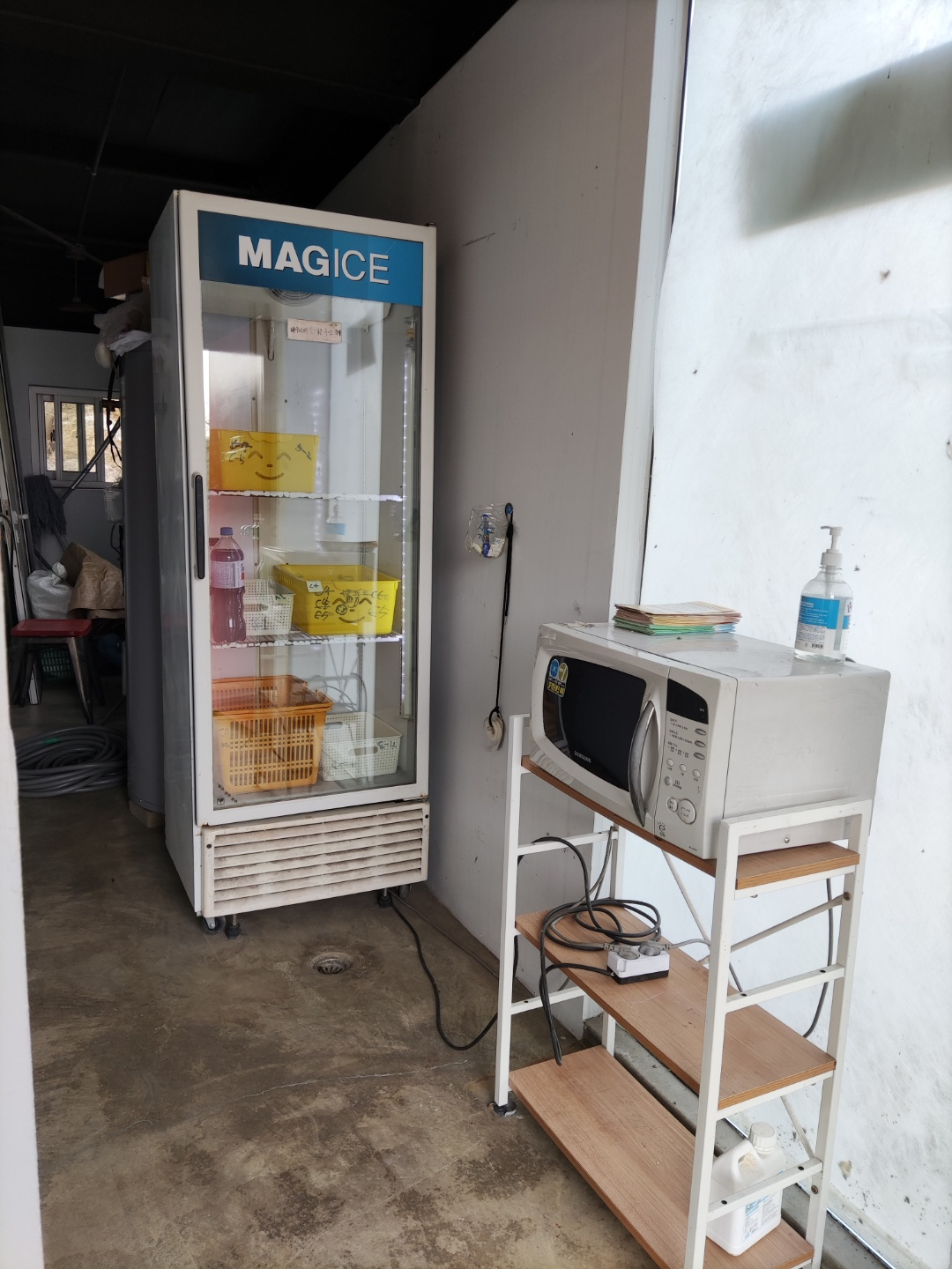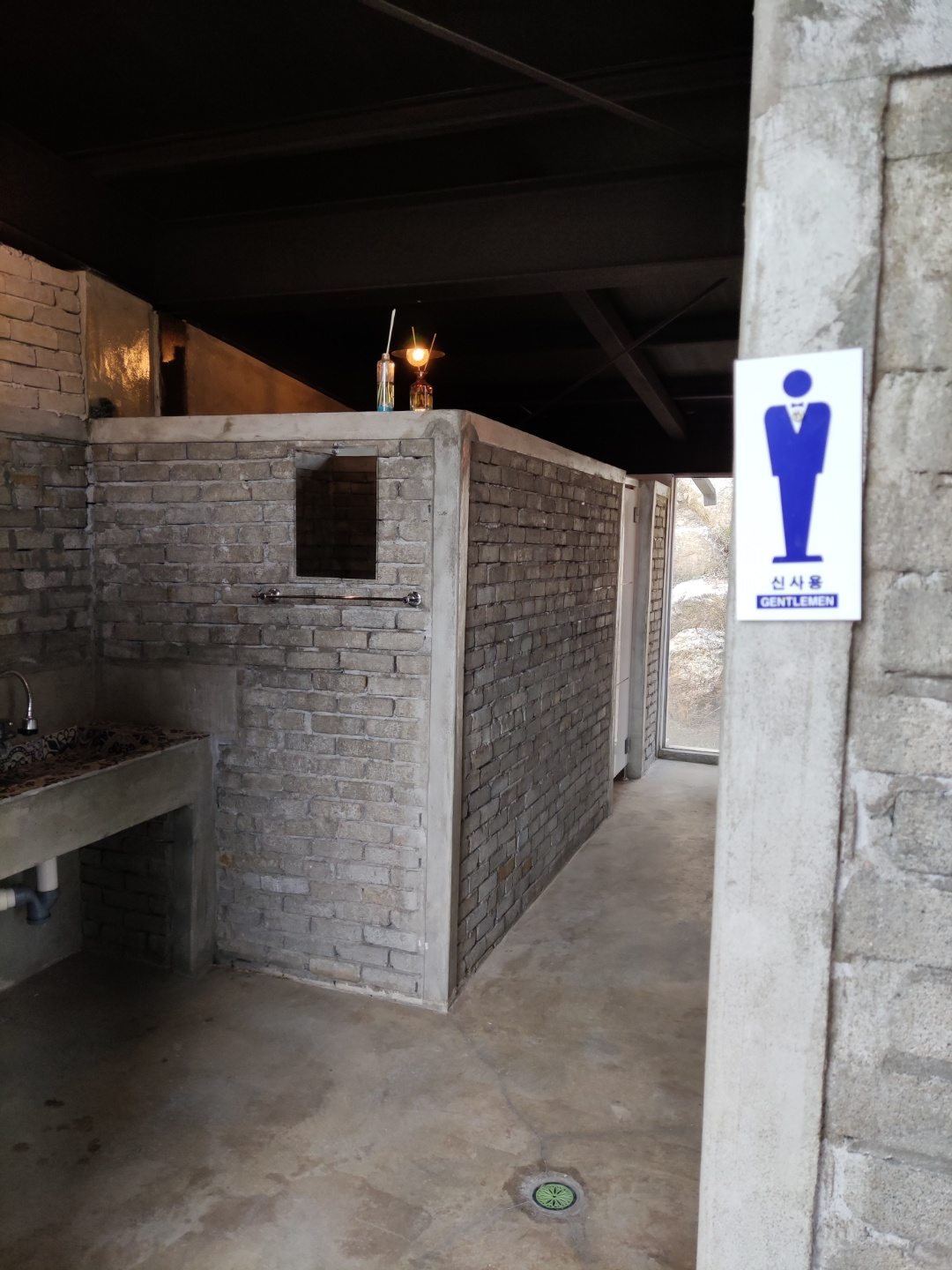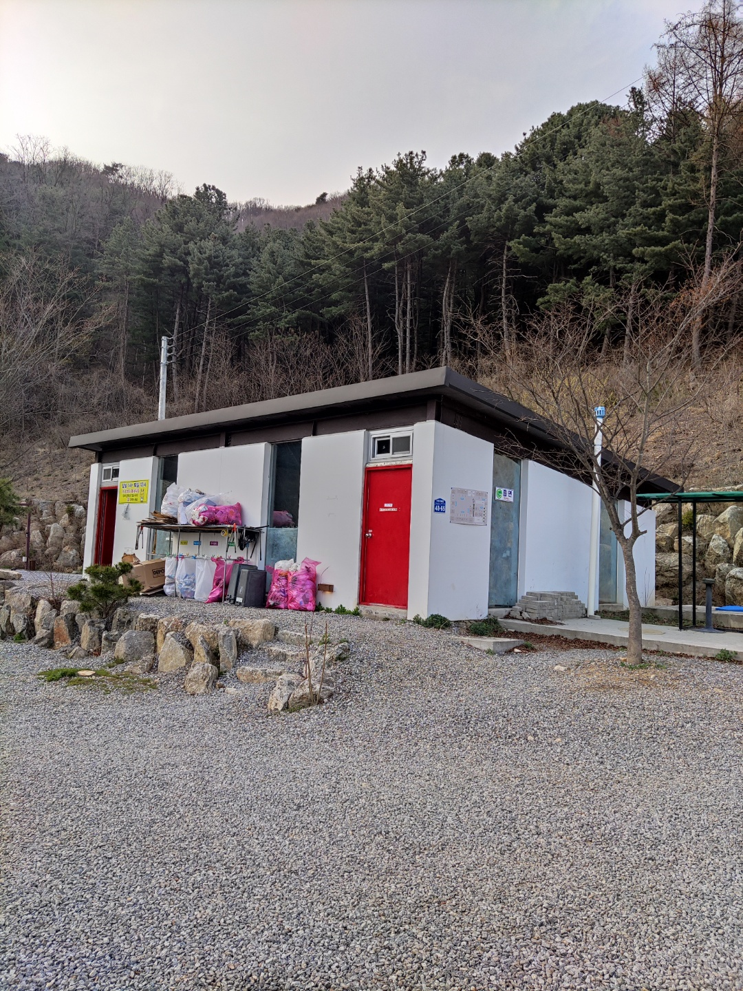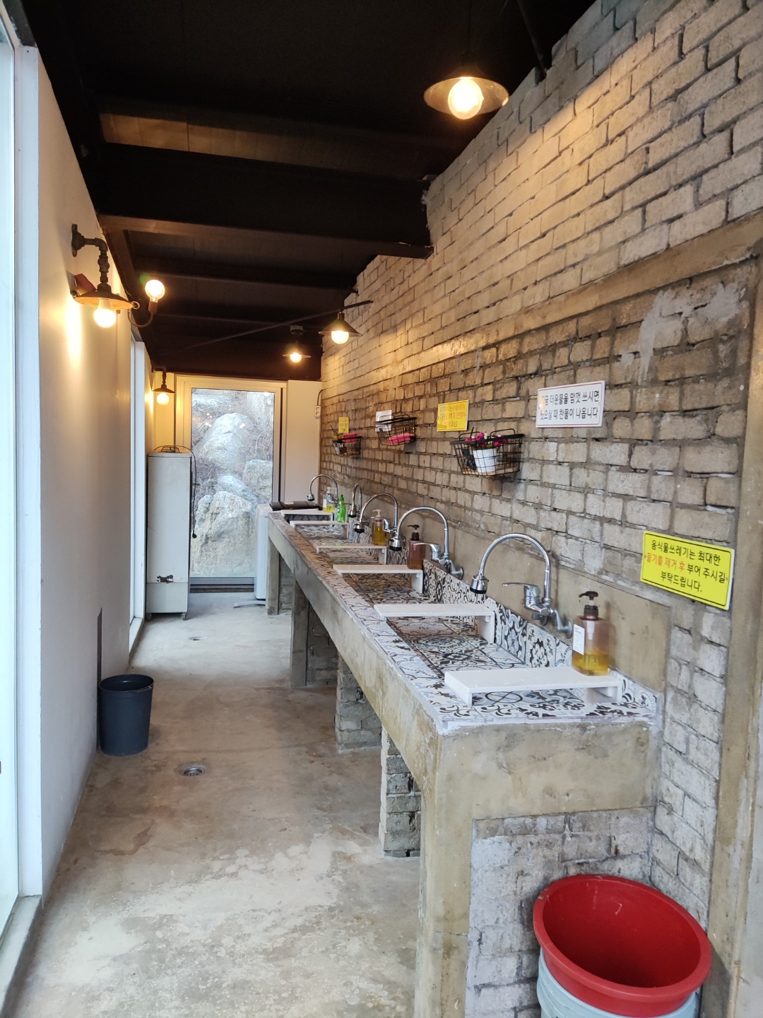 화장실과 개수대, 전자레인지, 공용 냉장고가 있는 건물입니다.