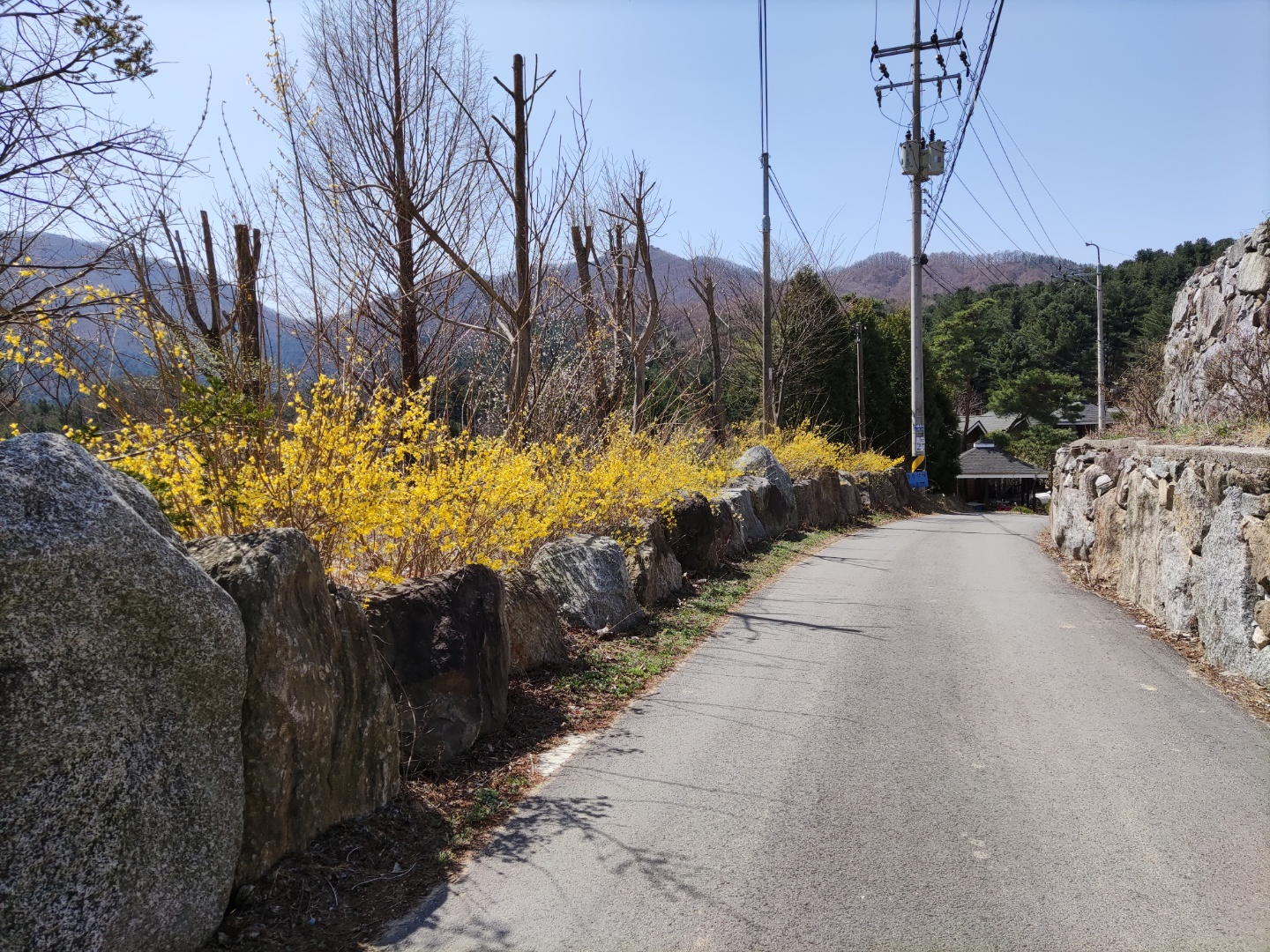 입구에 봄을 알리는 개나리꽃이 피어있었습니다.