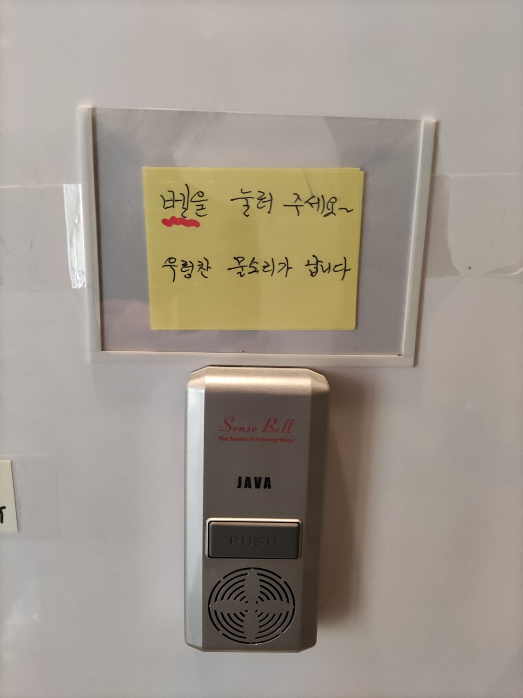 혹시나 볼일 중 바깥까지 소리가 들리면 어쩌지 당황스러웠는데 다행히 매너 벨이 비치돼 있어요.