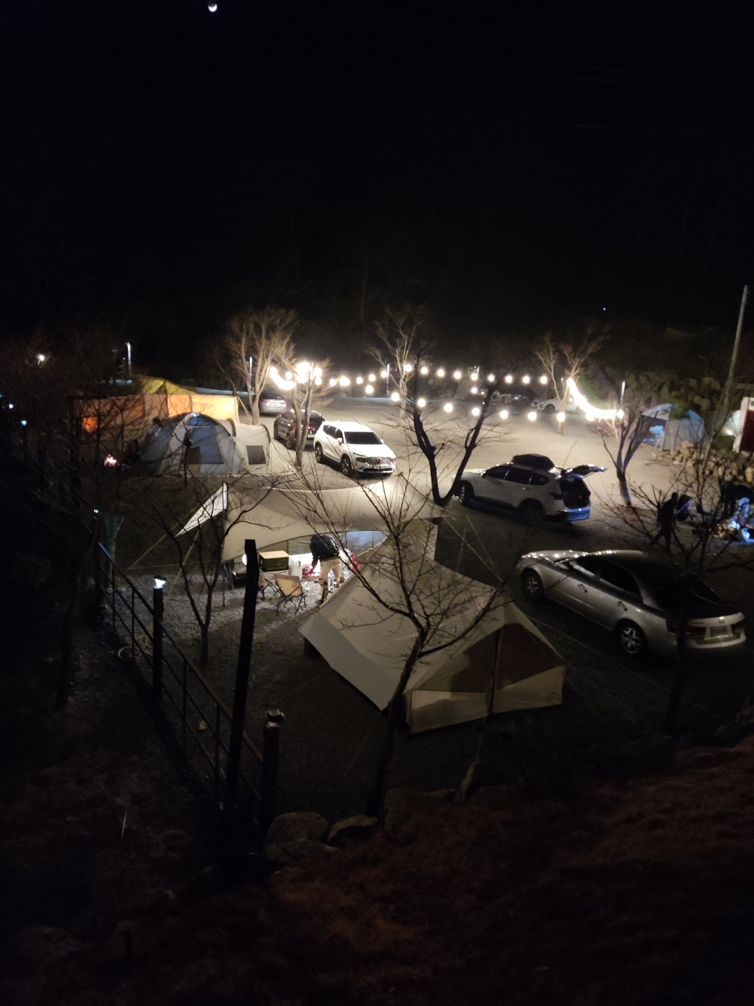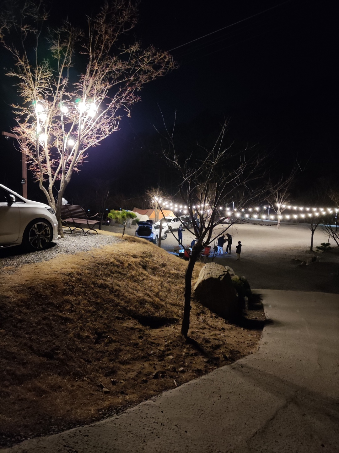 야간 캠핑장의 모습이에요. 조명이 켜져 있어 캠핑장이 더 아늑해 보입니다.