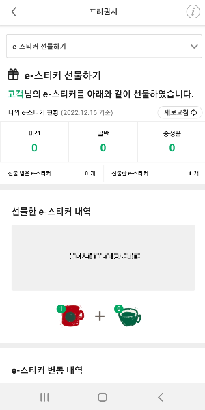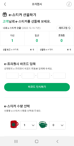 선물하기 화면으로 넘어와서 스티커 수량을 확인하고
